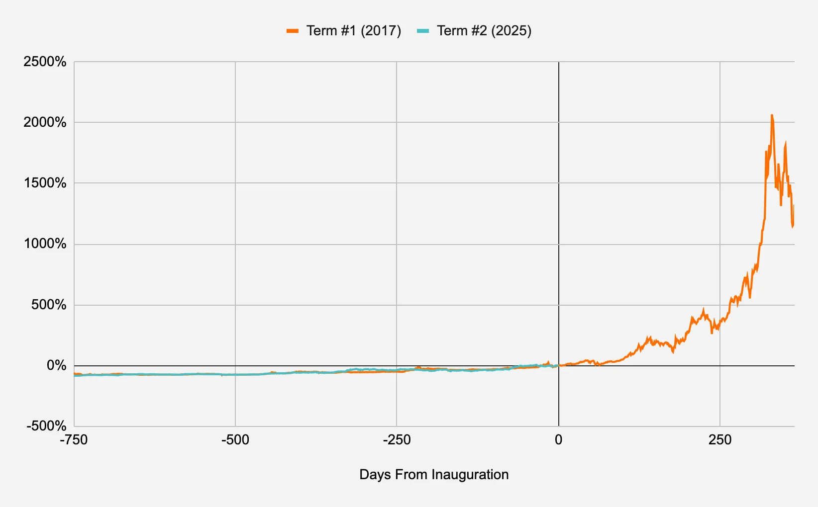 Despite the difference in market dynamics that BTC's dominance suggests, total market cap comparisons remain pretty supportive and the price action and industry growth remains pretty similar leading up to both inaugurations. This data suggests that while the internal composition of the crypto market has dramatically shifted, the overall market's behaviour patterns show remarkable consistency. The maintenance of strong correlations in growth patterns, despite vastly different market structures, points to: