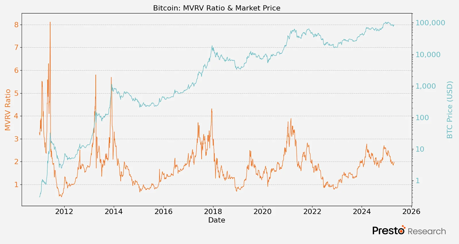 Bitcoin’s adoption as an investment asset has been ongoing since inception but accelerated after the Fed’s COVID-19-triggered quantitative easing in March 2020. The U.S. listing of spot Bitcoin ETFs in early 2024 further solidified this trend. Today, Bitcoin has become a full-fledged macro asset, with its price movements displayed alongside the S&P 500, Treasuries, FX rates, and commodity prices on major financial media like Bloomberg and CNBC. This evolution has two implications for MVRV.