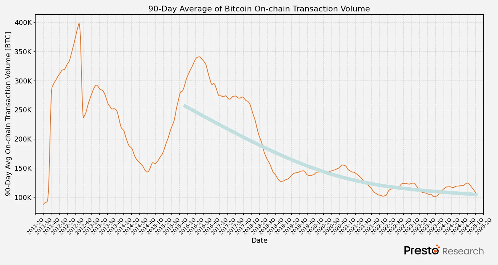 Bitcoin’s on-chain transaction volume in BTC has been declining since mid-2016, stabilizing within a narrow range in recent years (Figure 2). Consequently, price, rather than transaction volume, increasingly drives RV. In other words, RV is becoming a largely static metric, with price as its primary dynamic driver. This trend complicates historical comparisons, rendering past trading bands less relevant over the long run. Two factors explain the declining on-chain volume.